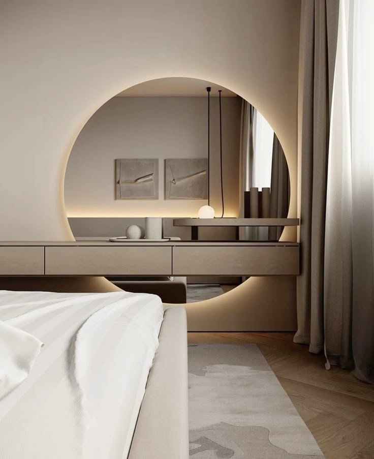 Upgrade your primary suite with the Bedroom Circle Mirror Dubai. A 160‑cm back‑lit circular mirror blends seamlessly into a curved plaster headboard wall, spilling warm light across the bedside. A minimalist floating console stretches below, housing push‑to‑open drawers for jewellery, skincare, and stationery. This design marries mood lighting, storage, and understated sculpture—perfect for Palm Jumeirah villas, Emirates Hills mansions, or chic Business Bay apartments.