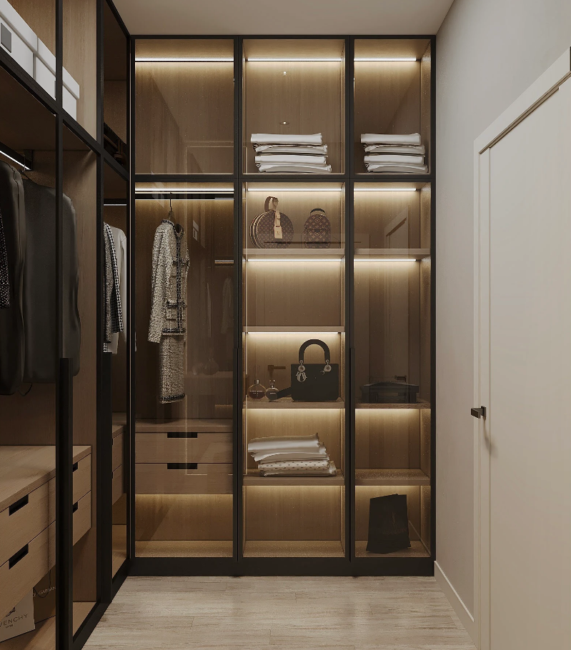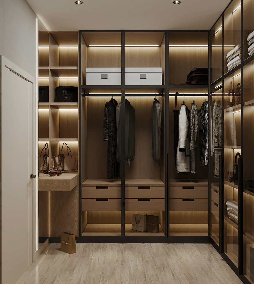 Crafted with sleek aluminum frames, high-quality glass panels, and integrated LED lighting, this custom wardrobe highlights your clothing, bags, and accessories in a luxurious display. The soft-close drawers, adjustable shelves, and smart hanging areas ensure your essentials are neatly organized while adding visual appeal to your dressing space.