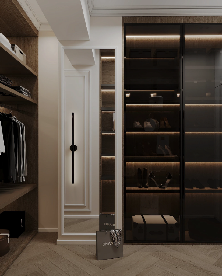 Our wardrobe closet features premium finishes, soft-close drawers, and adjustable hanging spaces, ensuring every item has its place. Glass-front doors with ambient LED lighting add a touch of luxury, while interior compartments offer ample room for clothes, shoes, and accessories. The sleek, minimal design complements modern interiors, making it a perfect fit for apartments, villas, or penthouses.