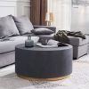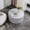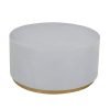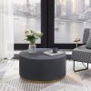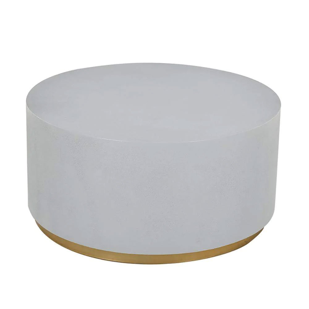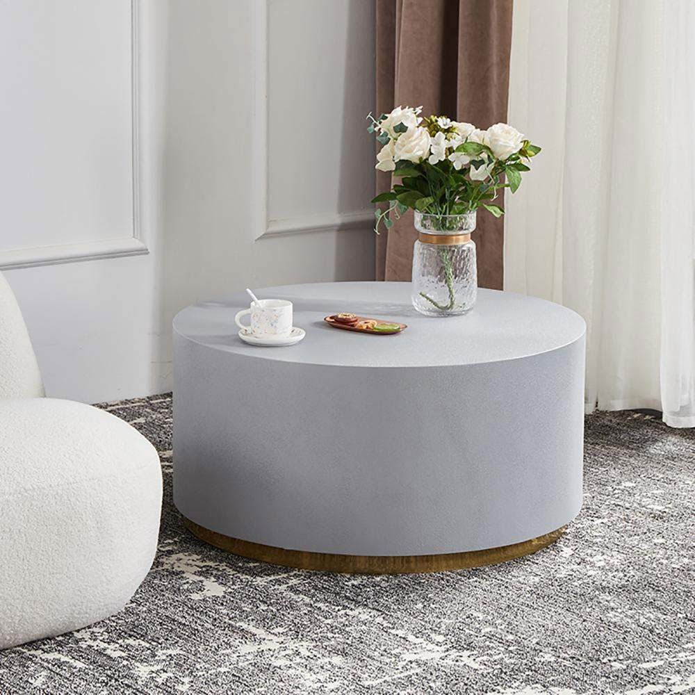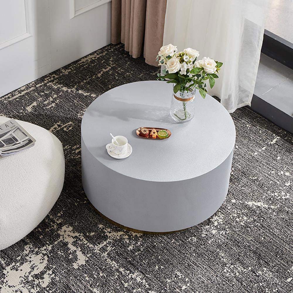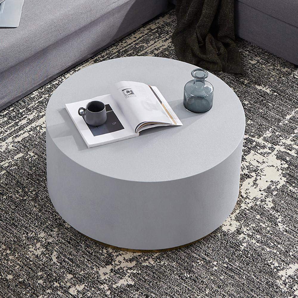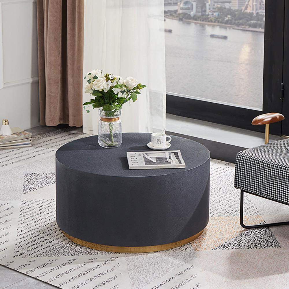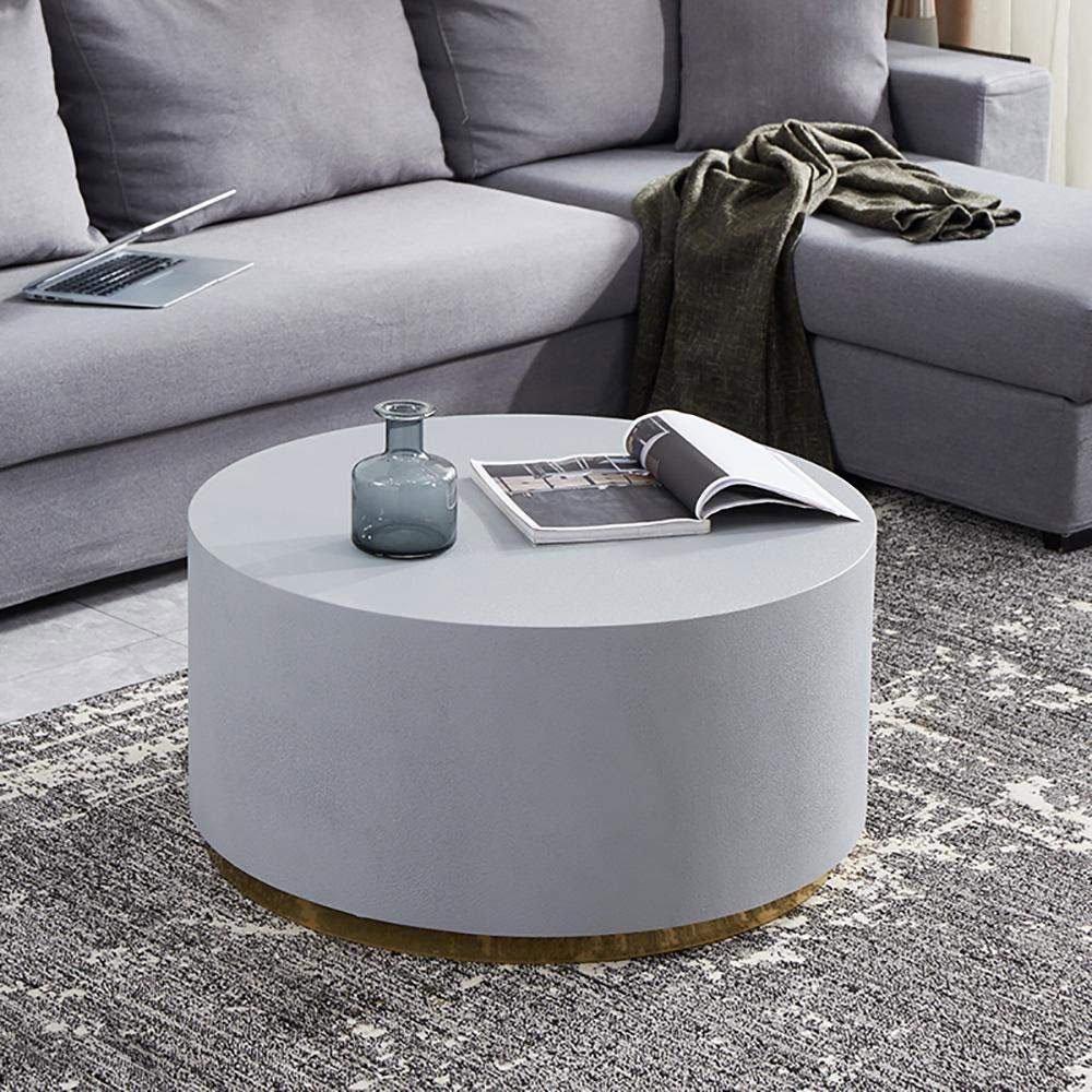 Upgrade your living room with our Industrial Coffee Table. This round coffee table features a clean-lined silhouette with a metal base in a luxurious golden hue. The thick, circular top resembles cement in a light gray color, adding industrial charm to your space. Perfect for contemporary homes, this unique design offers both functionality and style. No assembly is required, and maintenance is easy with just a wipe clean with a damp cloth and wipe dry with a clean cloth.