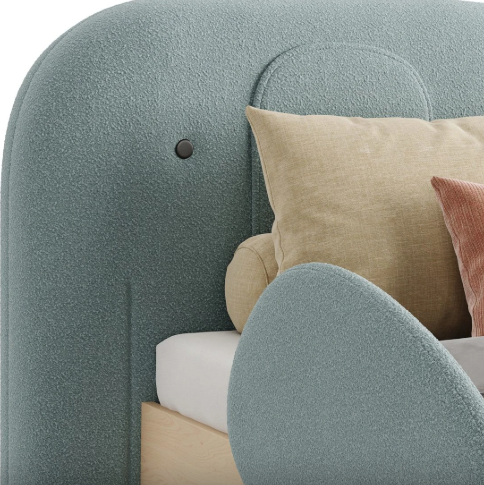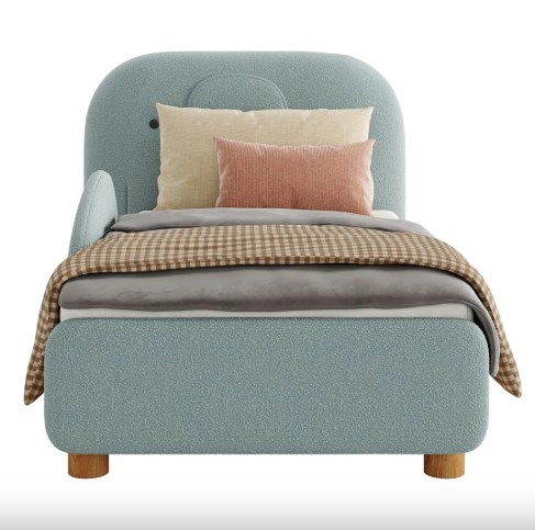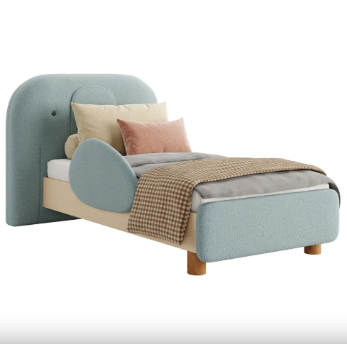 This kids bed Dubai design features a soft curved upholstered headboard and protective side panels, making it perfect for children. Built with strong MDF and high-quality fabric, it ensures durability and long-lasting performance.