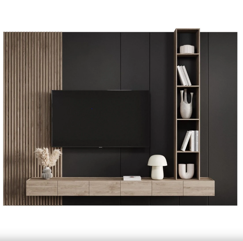 The sleek floating TV console provides discreet storage for media essentials, while the vertically stacked shelving tower offers a modern twist for displaying your favorite books, vases, and art pieces. Moreover, the natural wood slat detailing adds rich texture, balancing the dark tones beautifully.