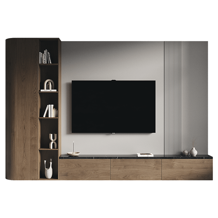 Add a touch of sophistication to your living space with this stunning modern floating TV unit in Dubai. Crafted with a sleek walnut wood finish and a durable structure, this entertainment unit features multiple open shelves for décor and books, alongside soft-close drawers for smart storage. Perfectly blending function and style, this TV cabinet is designed to suit urban interiors in Sharjah, Abu Dhabi, Ajman, and Umal.