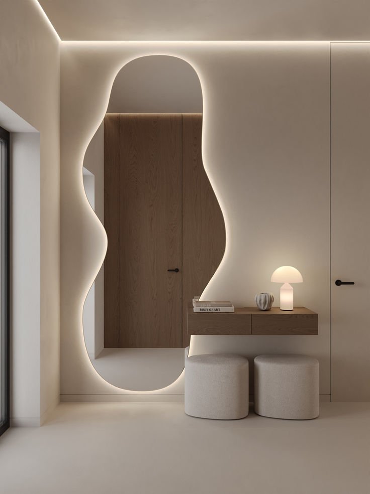 First, the free‑form mirror injects biomorphic curves, balancing the straight lines common in UAE apartments. Moreover, integrated dimmable LEDs serve as both mood lighting and practical illumination, eliminating shadow lines for flawless outfit checks. Finally, the push‑to‑open oak drawer hides keys and mail, while twin ottomans deliver hidden storage and an impromptu seating spot.