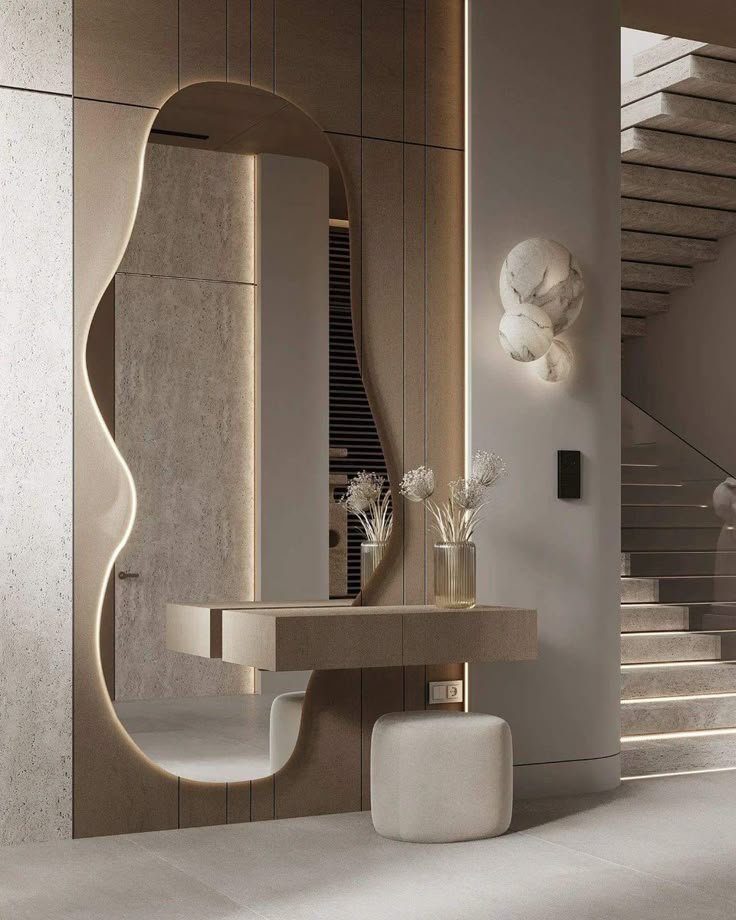 Bring biomorphic elegance into your hallway or bedroom with our Organic Shape Mirror Dubai console. A free‑form LED‑lit mirror flows across a warm oak veneer panel, while vertical inlay grooves echo its sinuous silhouette. The floating console below, clad in textured micro‑cement, provides hidden push‑to‑open storage, and a bouclé pouf slips underneath—proof that sculptural art can also be practical furniture.
