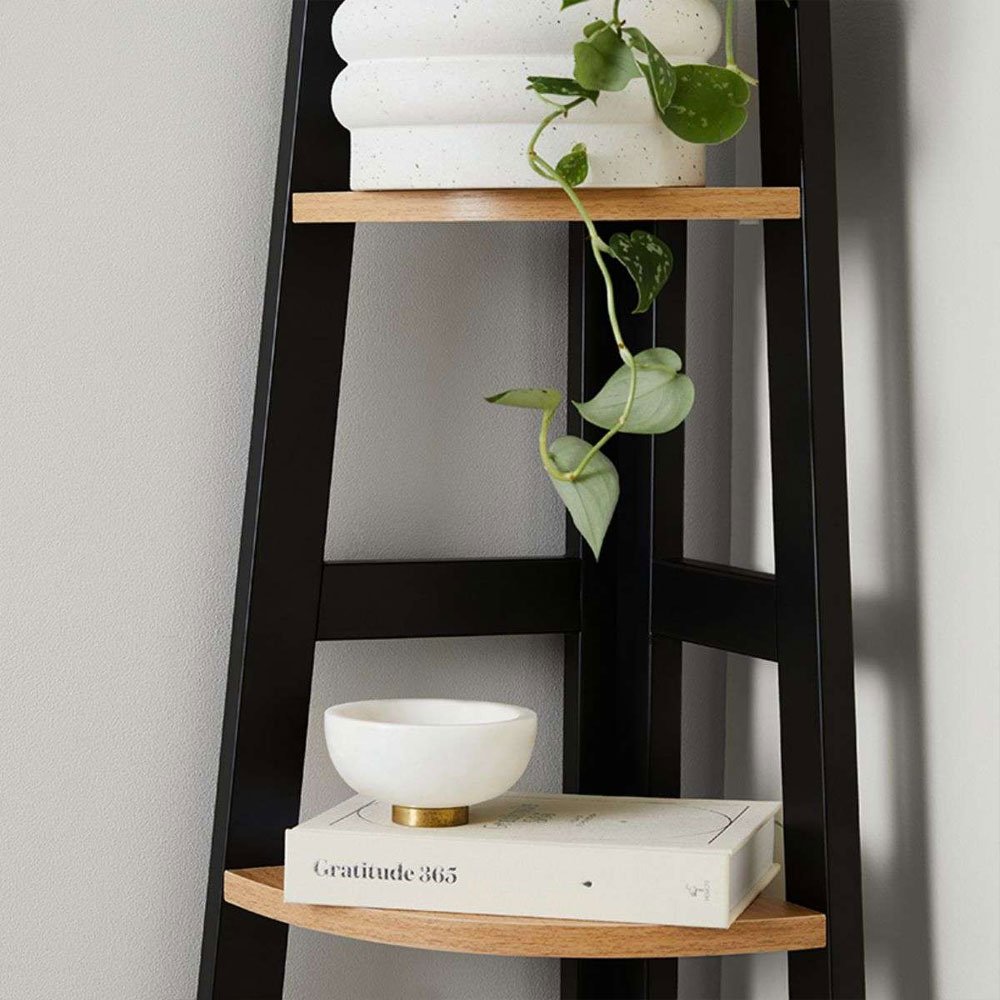 Crafted with a natural wood-look finish and a striking black metal frame, the Porto Corner Shelves combine style with utility. Ideal for displaying your favorite decor pieces—such as flowers, frames, candles, and prints—these shelves create a bold, modern outline in your home. Their design helps to declutter your space while enhancing the aesthetic appeal of any room.