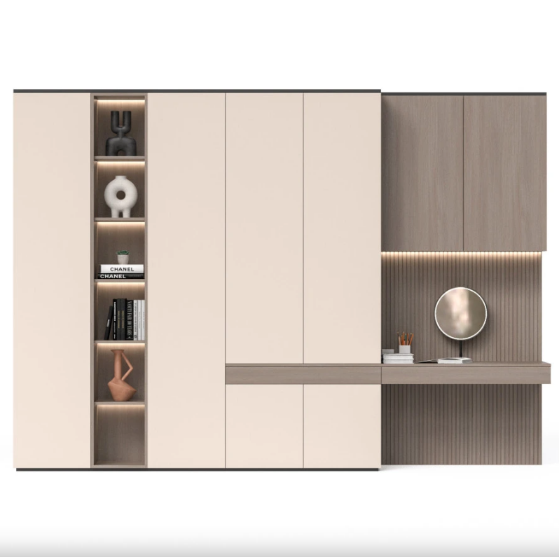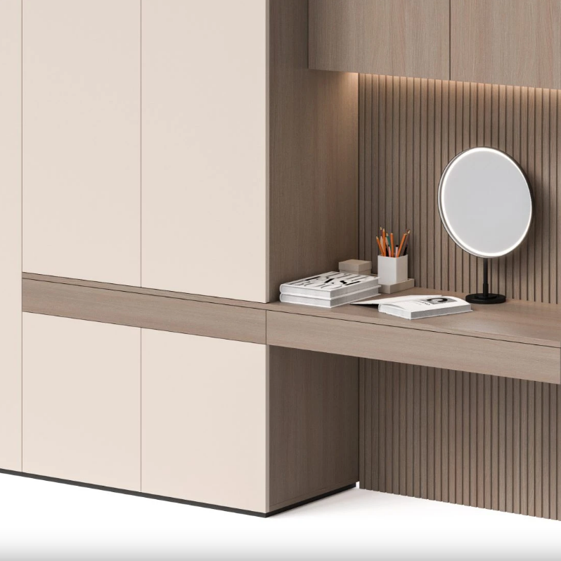 Transform your bedroom with our Wardrobe with Dressing Table Dubai. Soft fabric‑texture doors cloak ample hanging and drawer space, while a built‑in floating vanity, ribbed back‑panel, and vertical LED niche create a stylish morning routine zone. This seamless unit blends storage, display, and self‑care—all in a compact footprint ideal for Dubai apartments and villas.